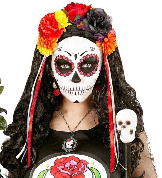 Bentita Flori Multicolore. Bentita include diverse flori prinse de bentita si panglici lungi atasate. Un accesoriu potrivit pentru o deghizare Dia de los muertos sau flamenco.
