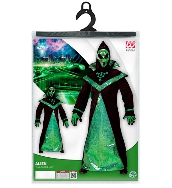 Costumul Alien Adult contine roba lunga si masca cu gluga atasata. Manusile nu sunt incluse.