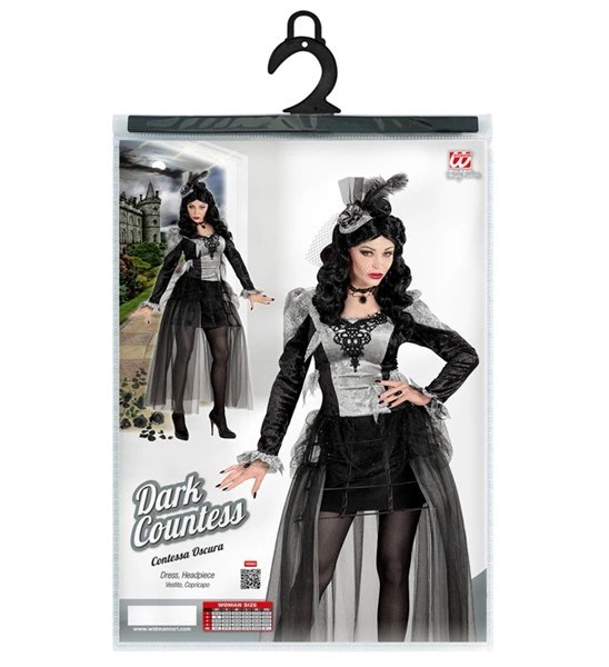 Costumul Contesa Intunecata include rochia gri cu maneci bufante, cu tulle aplicat si bentita cu mini palarie accesorizata cu voal si pene.