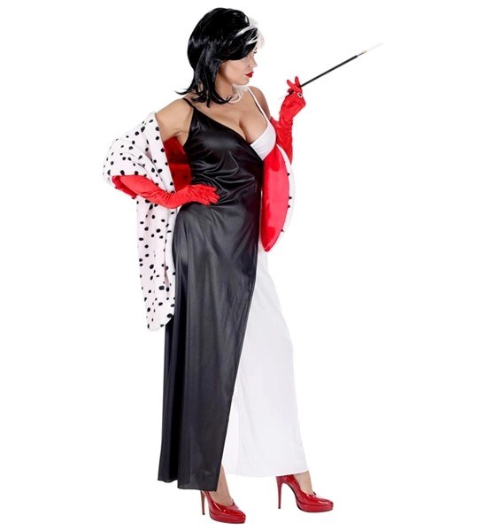 Costumul Cruella Demonia include rochia sexy cu slit in partea din fata si pelerina din blana artificiala. O deghizare de cinema pentru petrecerea de Halloween!