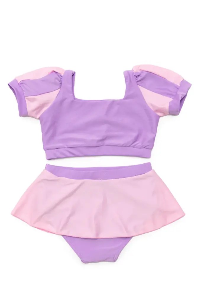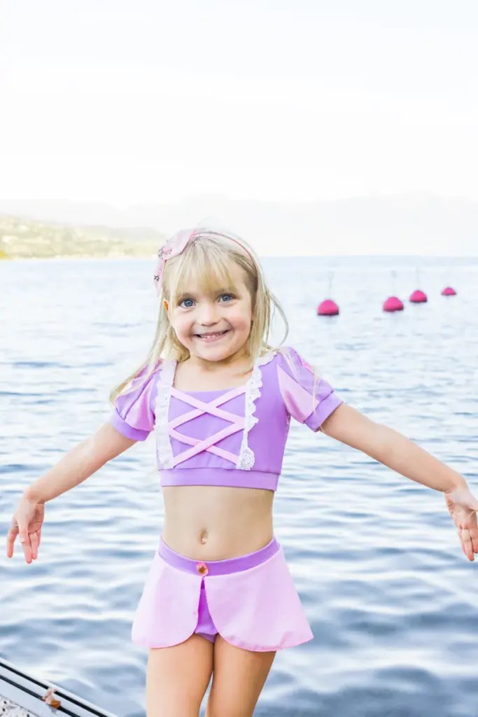 Costum de Baie 2 Piese Rapunzel. Costumul de baie pentru fetite contine topul si chilotelul. Costum disponibil pentru 3-4 ani (104-110 cm inaltime) si 5-6 ani (116-120 cm inaltime). Costumatia este realizata cu o mare atentie la detalii, avand o calitate superioara. Design realizat in Canada.