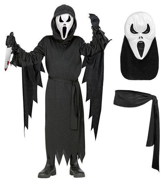 Costum Fantoma Tipatoare Scream Copii include roba neagra cu maneci supradimensionate avand fasii de material in colturi, gluga, masca si centura.