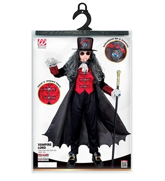 Costumul Lord Vampir Copii include jacheta lunga cu vesta atasata, jabou si palarie.