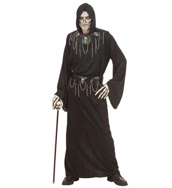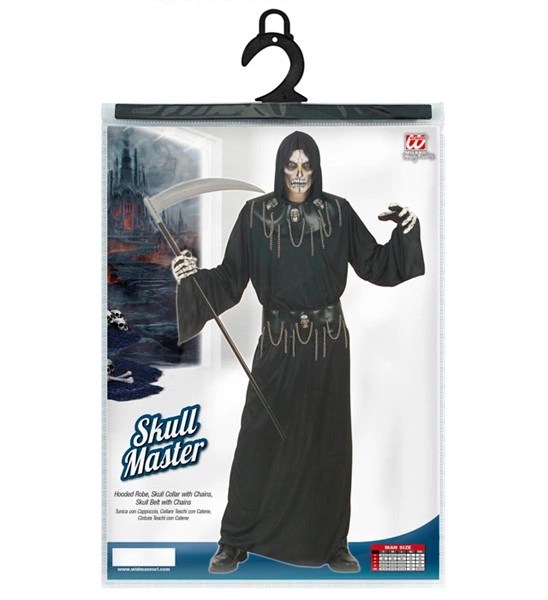 Costumul Master Skull include roba cu gluga, guler si centura accesorizate cu capete de schelet si lanturi. O deghizare potrivita pentru petrecerea de Halloween!