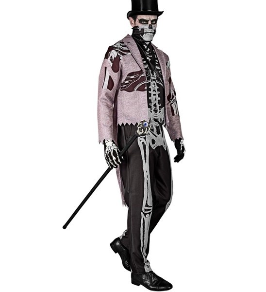 Costumul Mire Schelet Adult include fracul cu vesta astasata, pantalonii si masca. Palaria si bastonul nu sunt incluse.