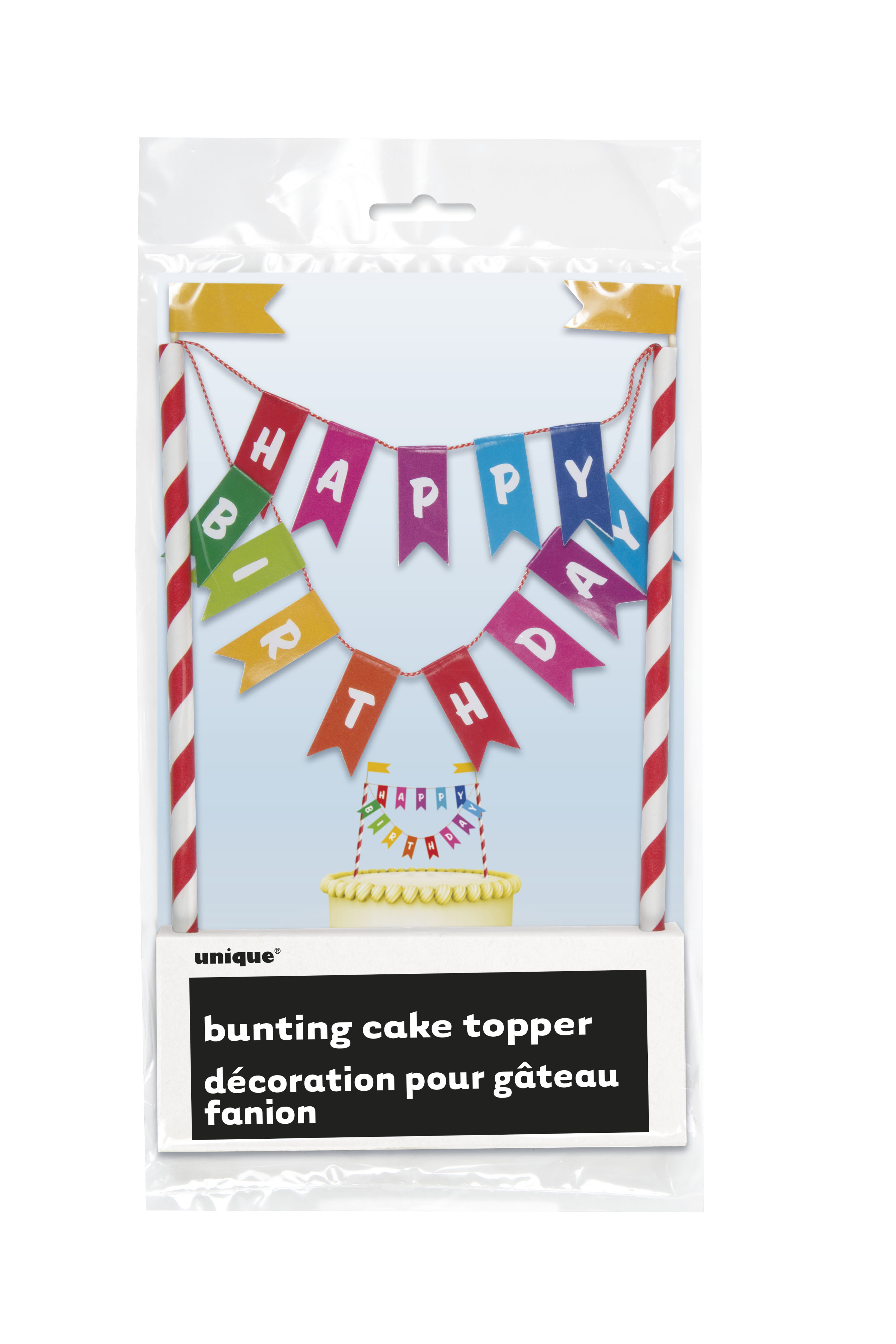 Decoratiune Tort Stegulete Happy Birthday. Un mod haios si inedit de a decora tortul aniversar. Sunt incluse cele 2 bete suport cu stegulete galbene aplicate si ghirlandele cu text Happy Birthday.