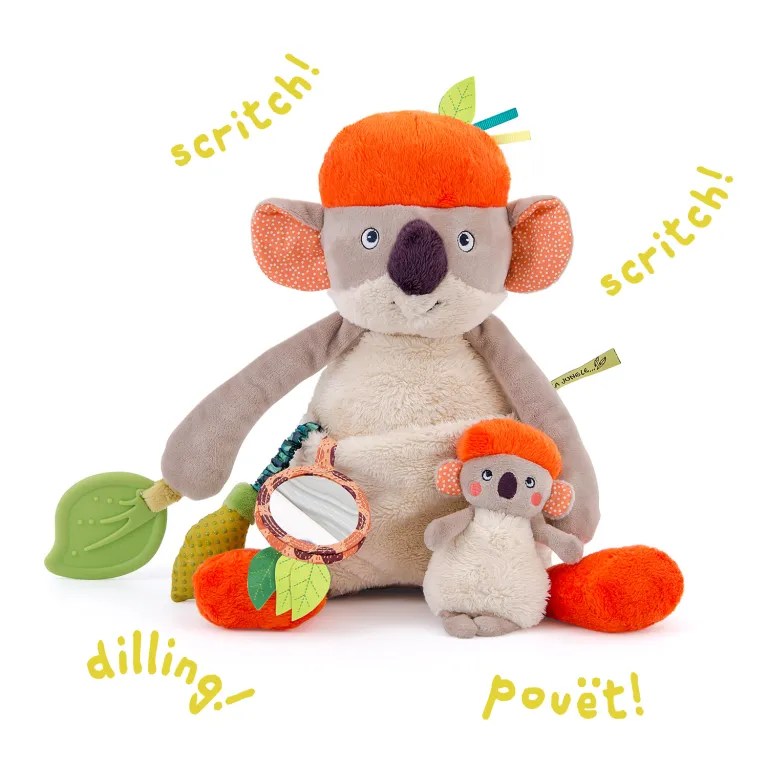 Jucarie de plus cu activitati, Koala Koco, Moulin Roty. Aceasta jucarie de plus are suficiente activitati pentru a-l distra pe micutul tau pentru o lunga perioada de timp: un koala bebelus, o oglinda, un clopotel, o frunza din cauciuc ideala pentru a calma gingiile delicate ale bebelusului, dar si diverse etichete. Koco Koala va ajuta la stimularea simturilor: tactil, auditiv si vizual, datorita diferitelor texturi, culori si sunete produse de acest plus moale. O jucarie atat utila cat si distractiva!