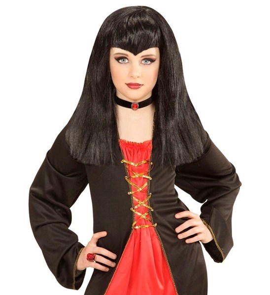 Peruca Vampirita Copii, model cu breton, lunga, de culoare neagra. Peruca este perfecta pentru deghizari, precum vampir.